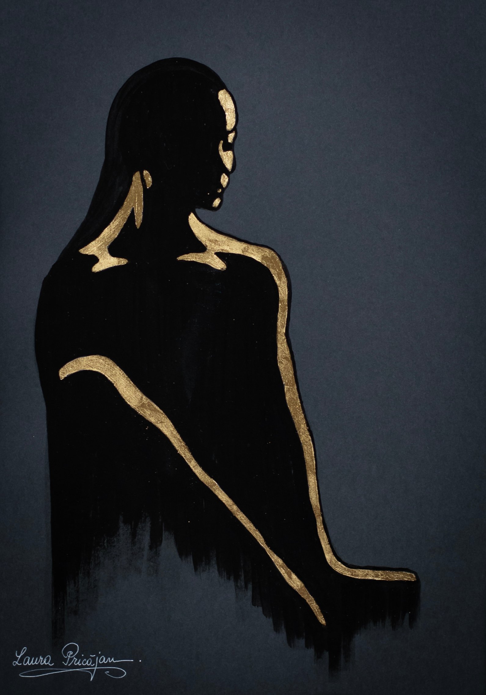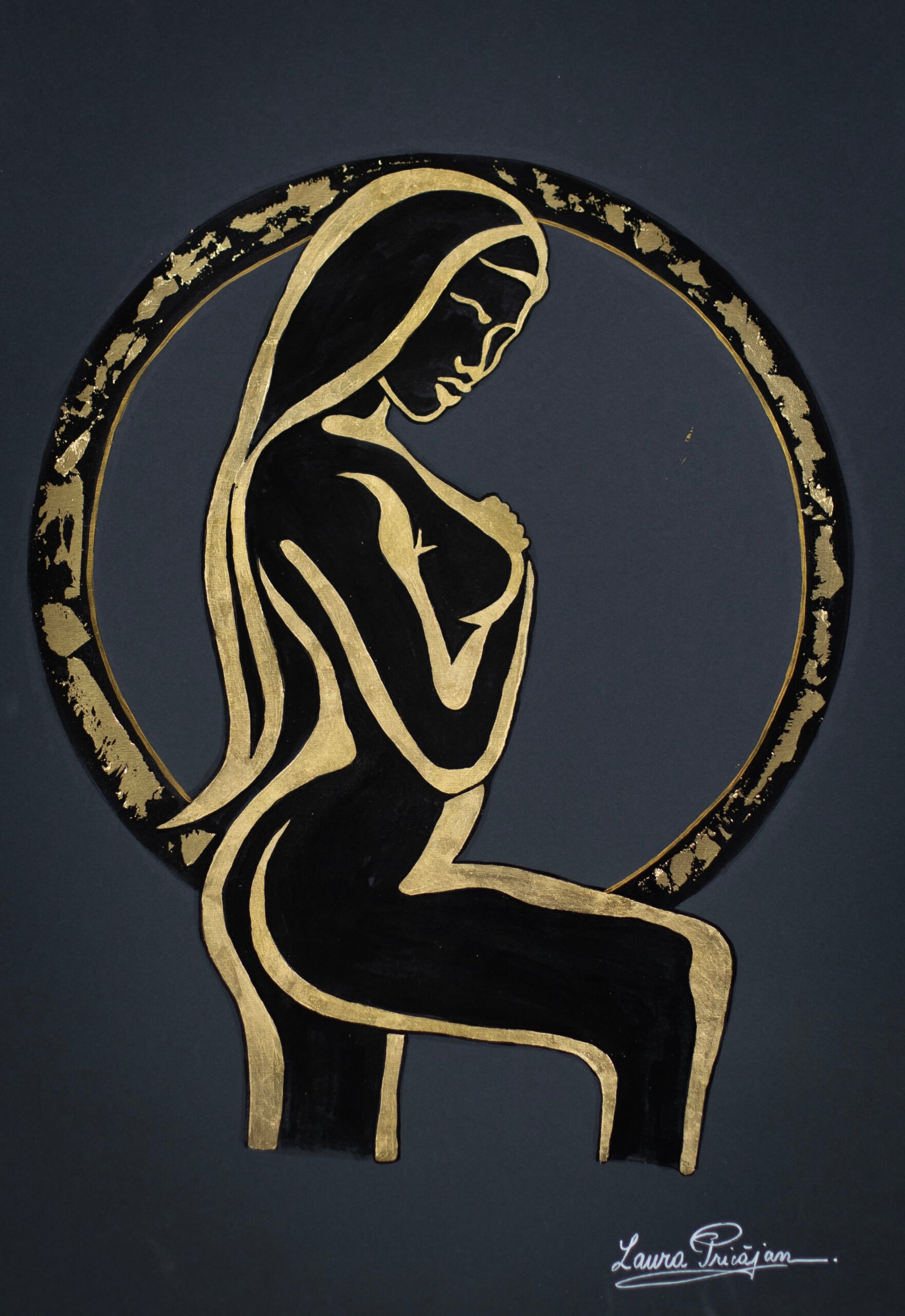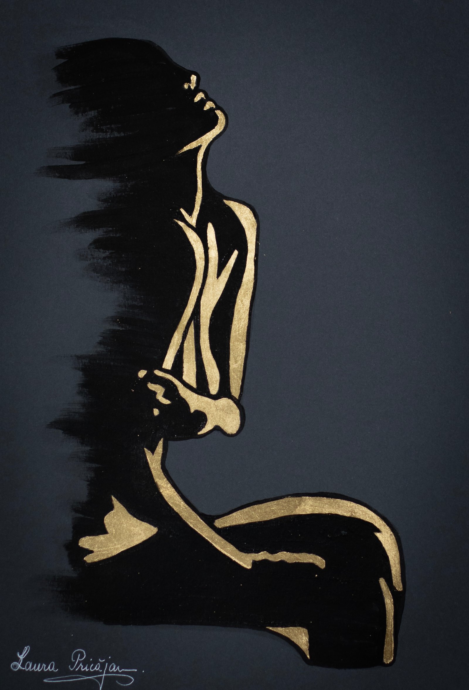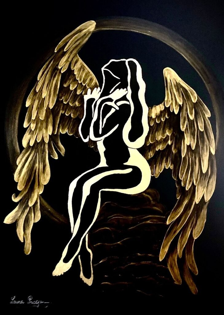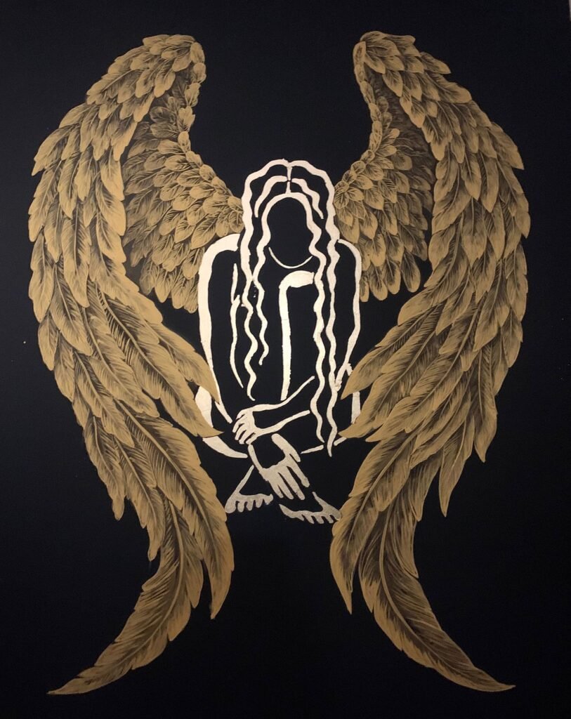 Your painting transforms the idea of “rediscovering” into a luminous, sacred rite: the seated figure, reduced to an elegant silver silhouette, becomes a vessel for light against the deep ground, while the meticulously rendered golden wings encircle her like a protective arch. The symmetry of the wings contrasted with the diagonal posture creates a balanced yet dynamic composition, and the star above operates as a conceptual anchor—a compass for inner navigation—so the viewer feels a quiet pull toward transcendence. What works especially well is the interplay of negative space and metallic textures, which gives the piece both serenity and radiance; the feather work shows impressive control and patience, and the restrained palette heightens the contemplative mood. Overall, the piece fuses craft and concept with clarity, inviting us into a personal journey of resilience and self-illumination.