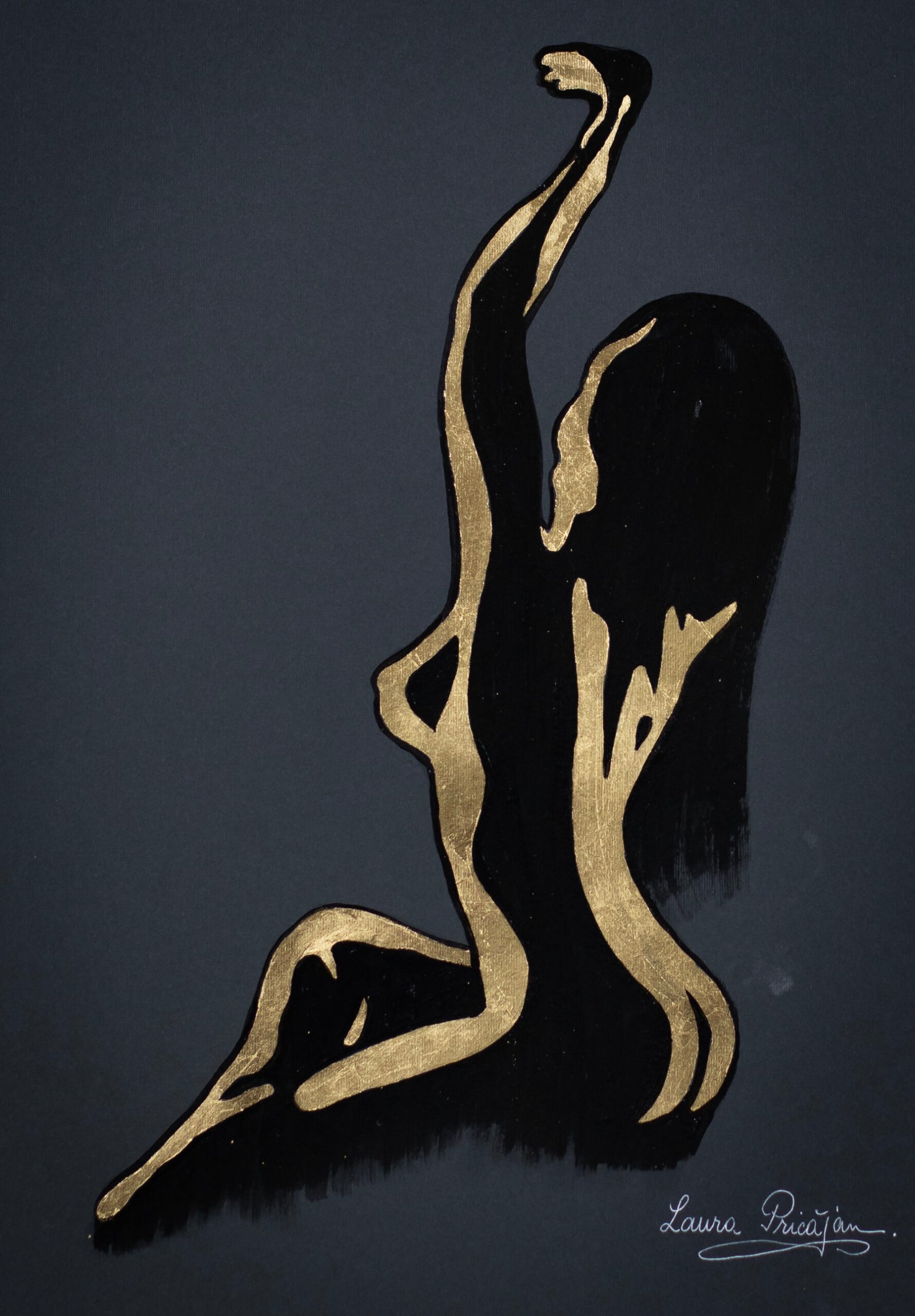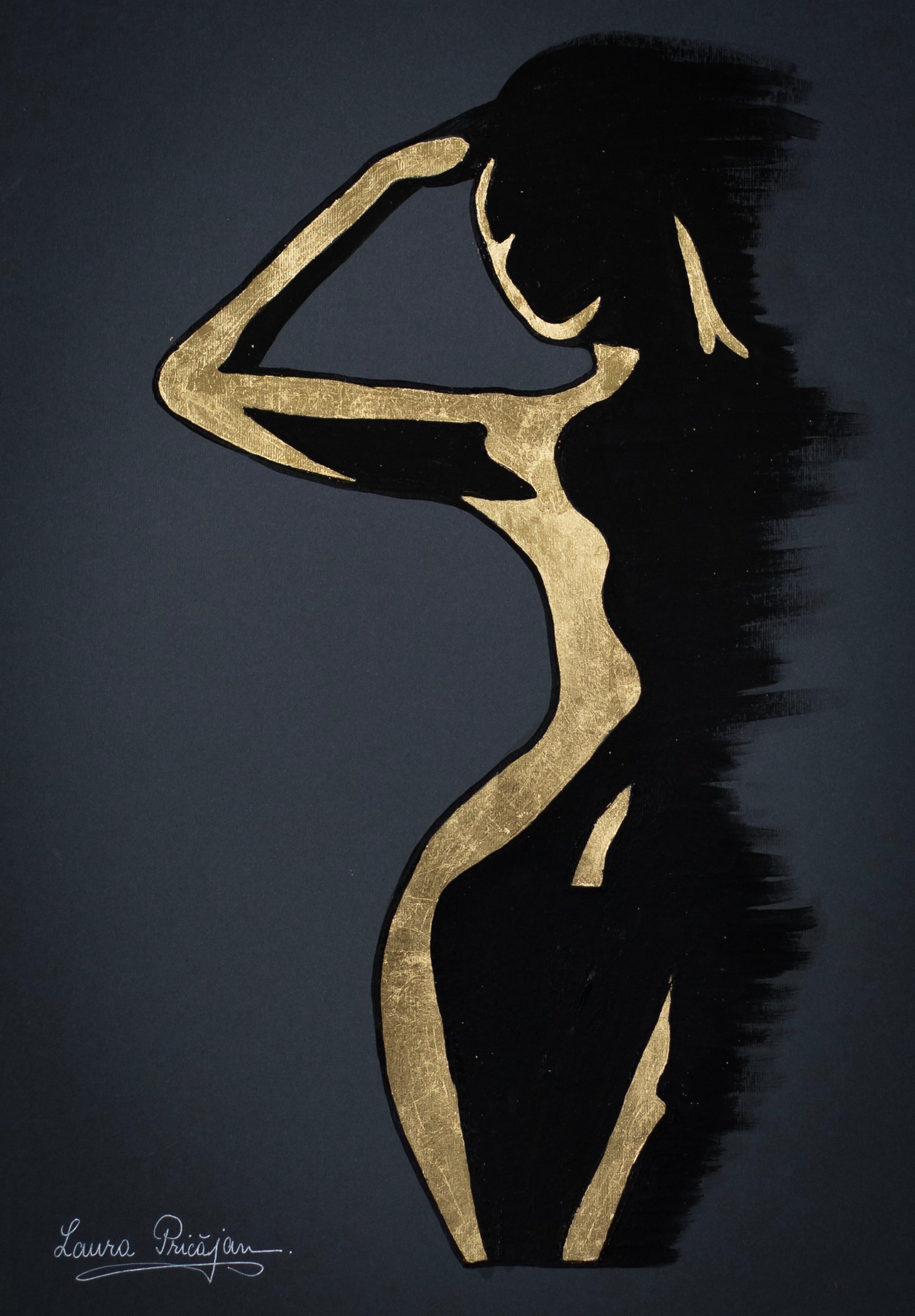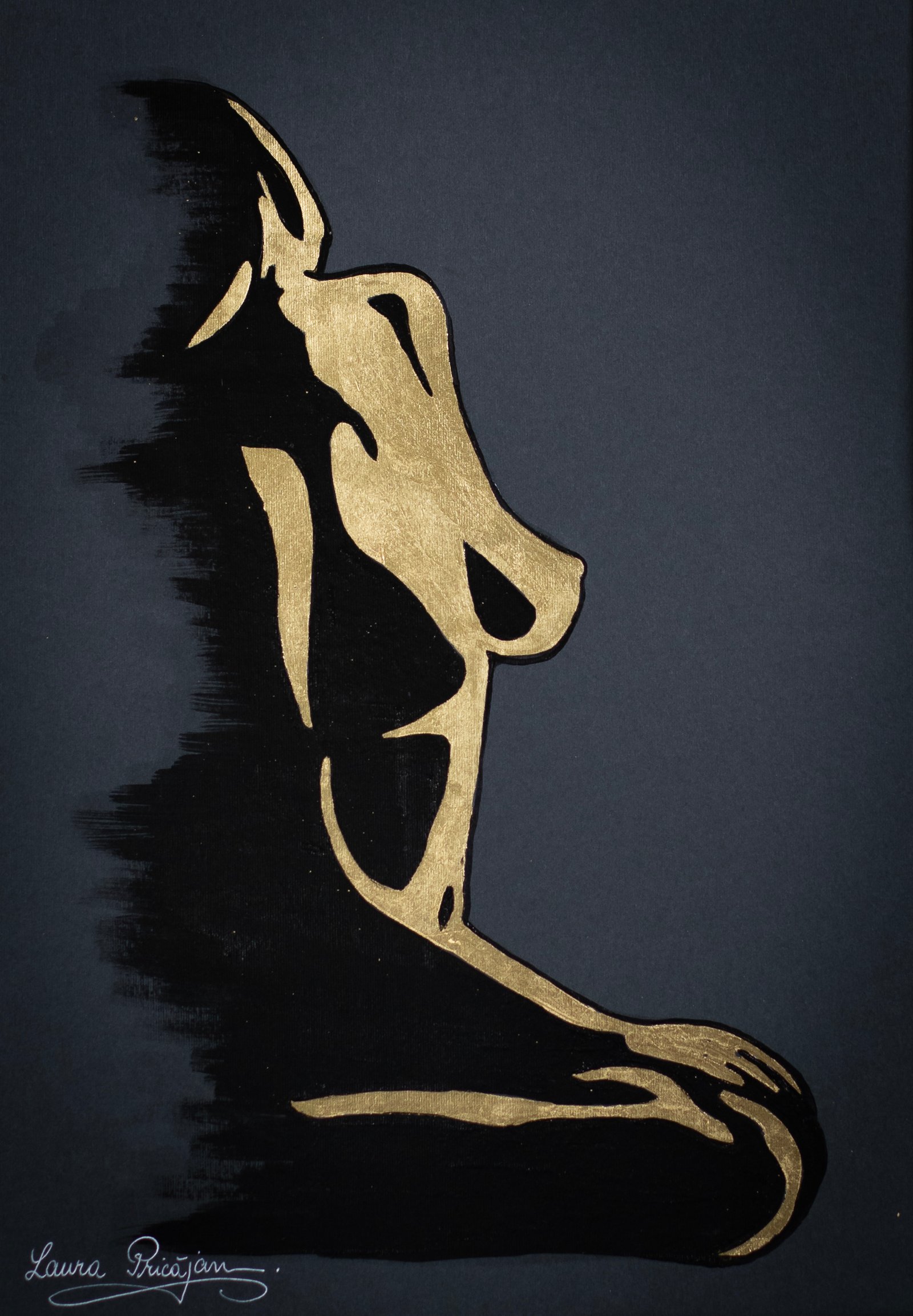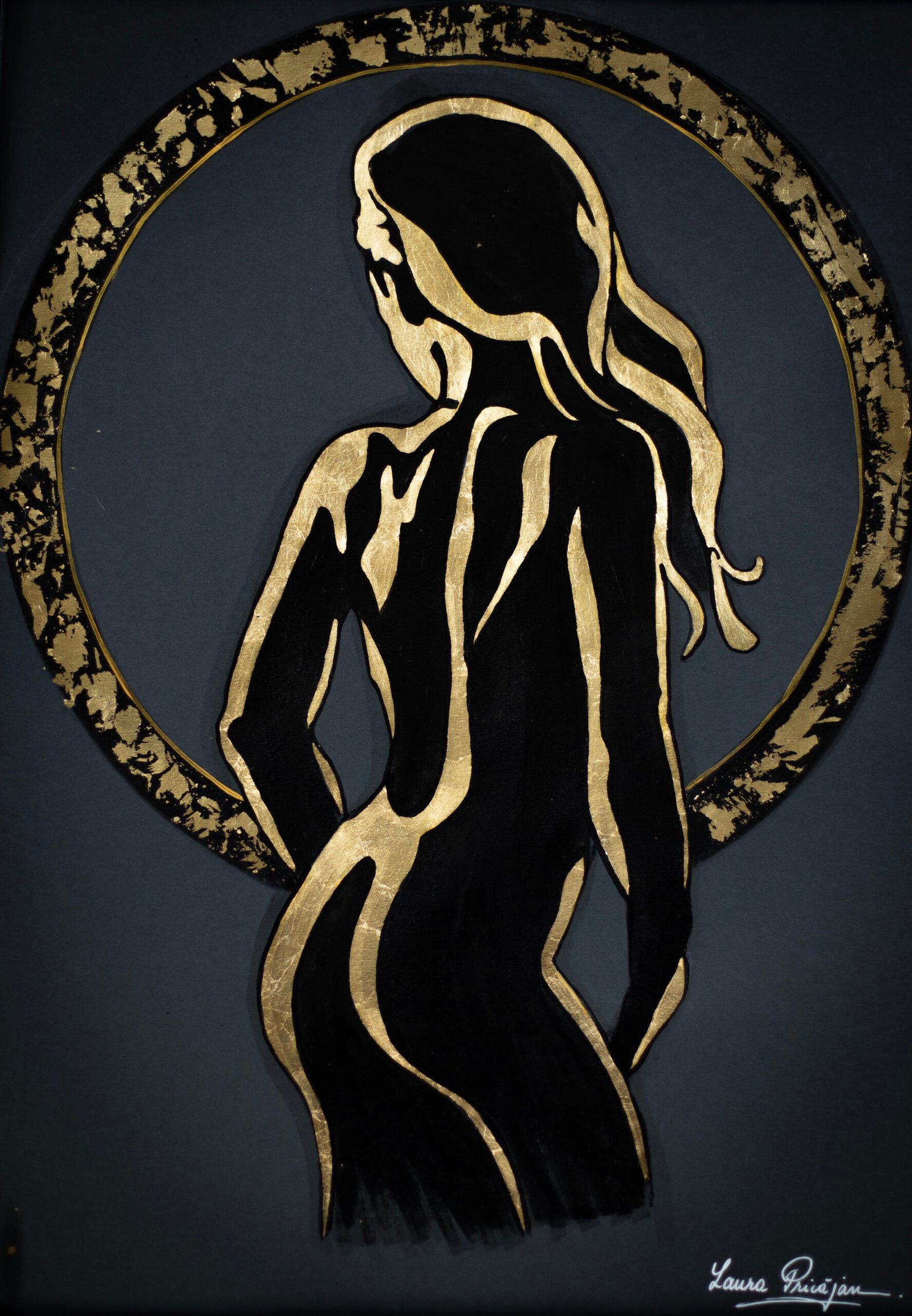 Your painting transforms the idea of “rediscovering” into a luminous, sacred rite: the seated figure, reduced to an elegant silver silhouette, becomes a vessel for light against the deep ground, while the meticulously rendered golden wings encircle her like a protective arch. The symmetry of the wings contrasted with the diagonal posture creates a balanced yet dynamic composition, and the star above operates as a conceptual anchor—a compass for inner navigation—so the viewer feels a quiet pull toward transcendence. What works especially well is the interplay of negative space and metallic textures, which gives the piece both serenity and radiance; the feather work shows impressive control and patience, and the restrained palette heightens the contemplative mood. Overall, the piece fuses craft and concept with clarity, inviting us into a personal journey of resilience and self-illumination.